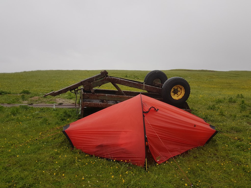 Lodgen jälkeen liikahdetaan vielä jokunen kilometri kanervaista rinnepolkua (feat mini-henge) kohti reitin ensimmäistä metsikköä (puut ovat aika harvassa tuulisaarilla), jonne on sijoitettu paikallisen julkkiskarhu Herculesin muistokivi ja patsas. Asettelemme teltat metsikköön aika lähelle karhua ja mahdollisen kaatuvan puun alle (tai siis Villelle varattiin se paikka): sataa. Ville haluaisi olla muualla kuin kaatuvan puun alla, mutta minusta se on juuri oikea sijainti. Keskustelemme puiden asennoista ja nukumme, Ville ehkä ikuisesti jos tuuli yltyy.