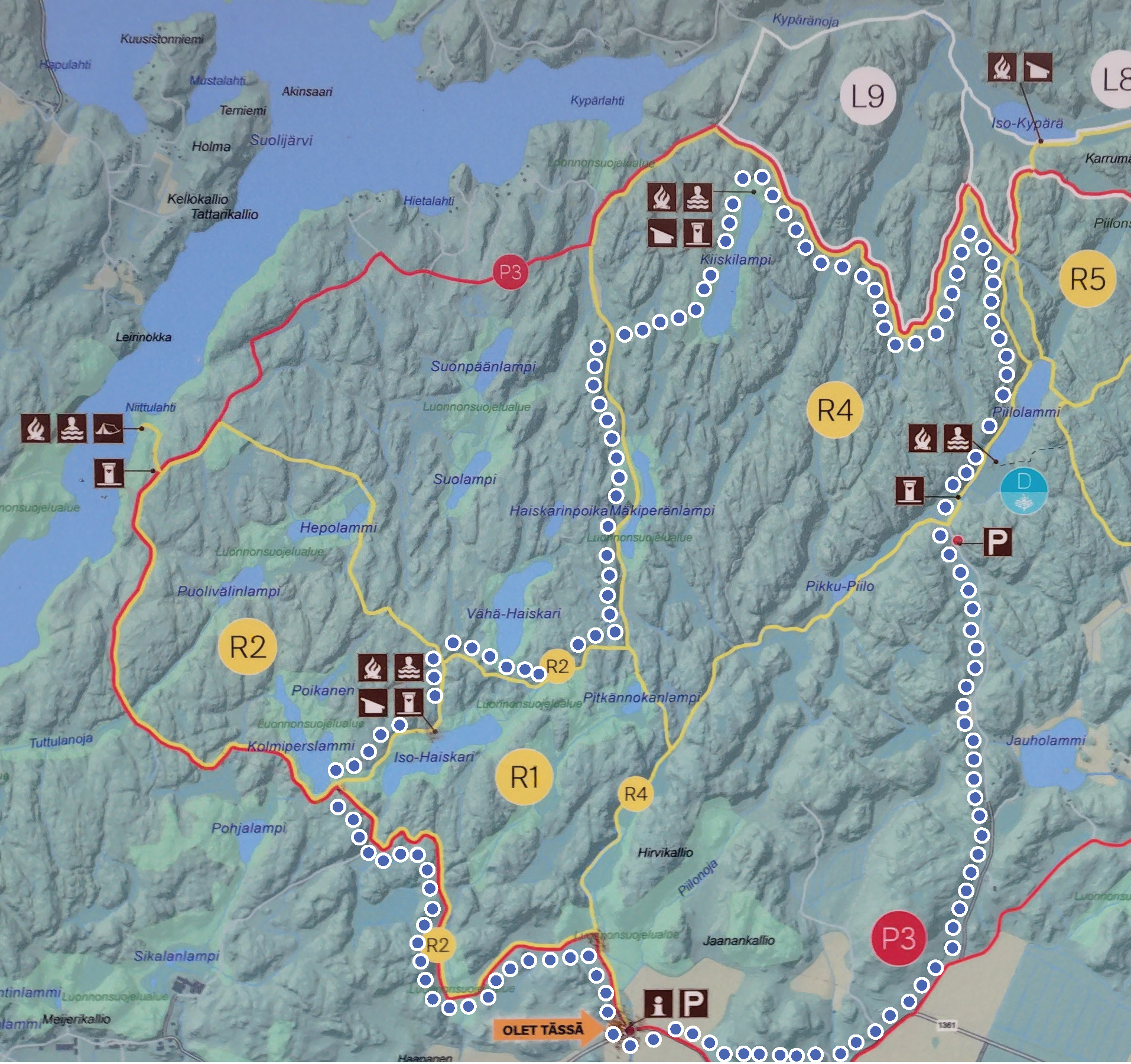 Ensimmäisenä etappina reitillä vastaan tuli Iso-Haiskarin laavupaikka, joka oli muutoin eri kelpo, mutta sehän on ihan siinä ison purtsin kyljessä. Maaliskuun 1. päivänä paikalla oli vain yksi pariskunta rapsimassa märkiä oksia bensalla, mutta ei ne sittenkään syttyneet. Puuhuolto on ilmeisesti nykyään talviaikaan seis muualta paitsi Piilolammilta, mutta siellä niitä polttajiakin sitten on. Ota omia pölkkyjä liepeen alle ja vaikkapa yksi taikahalko Ohlsonin Klasulta.