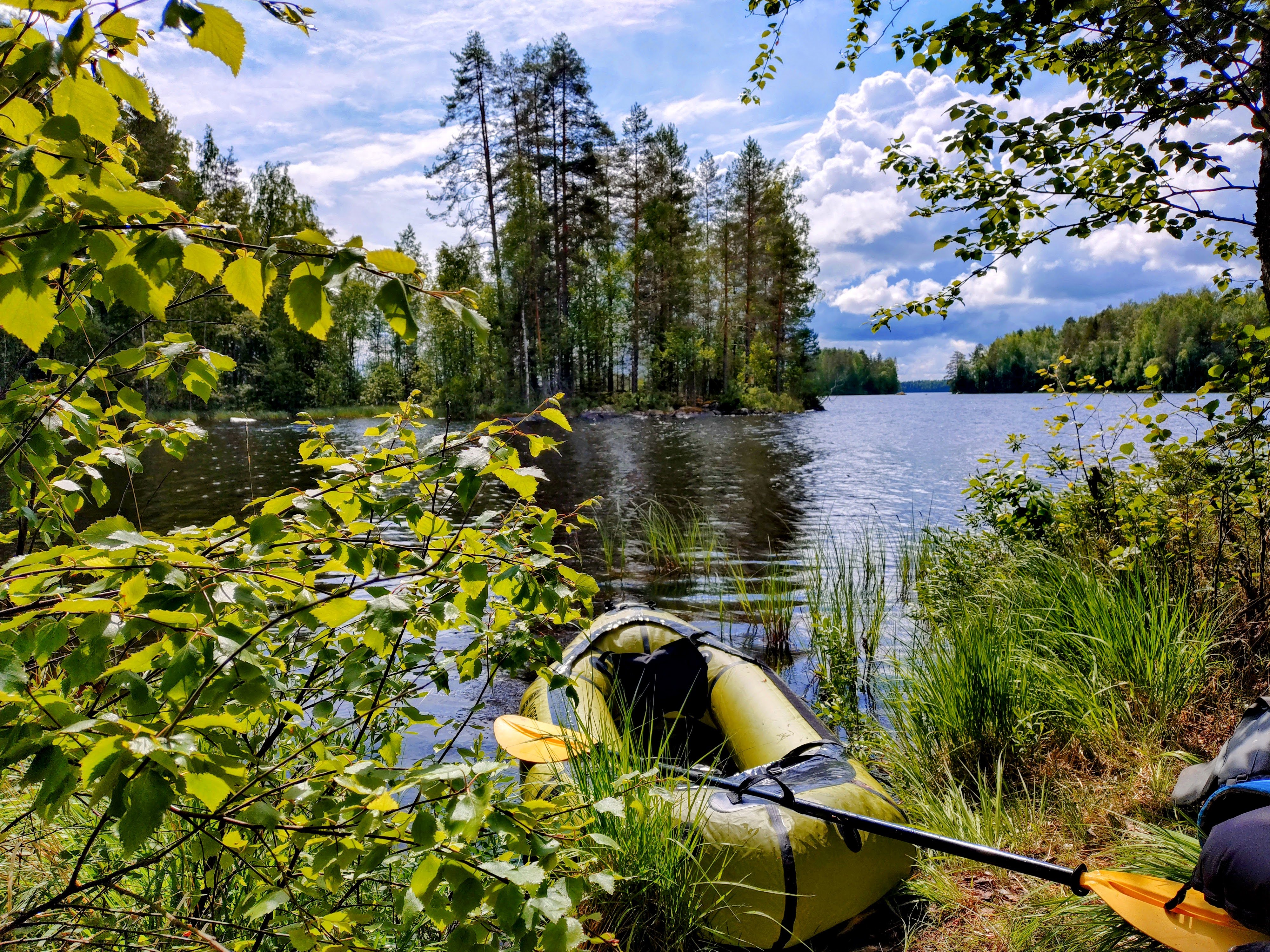 Rantaan päästyä elämä alkaa kuitenkin taas hymyillä: sade ei vieläkään ollut alkanut ja rantakivikko oli kohtuullisen toimivaa laiturin korviketta. Norseraft pullistui sähköulistimella tuskattomasti, eväsbanaani oli vielä ehjä repussa. Nyt kyllä.