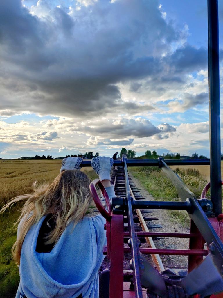 Illan viimeisten turistikyytien ja asemakahvilan sumppien jälkeen meidät tönäistiin liikkeelle kahdessa kärryssä. Idea löytyi nopeasti ja elokuinen peltoraidemaisema oli ihan 5/5.