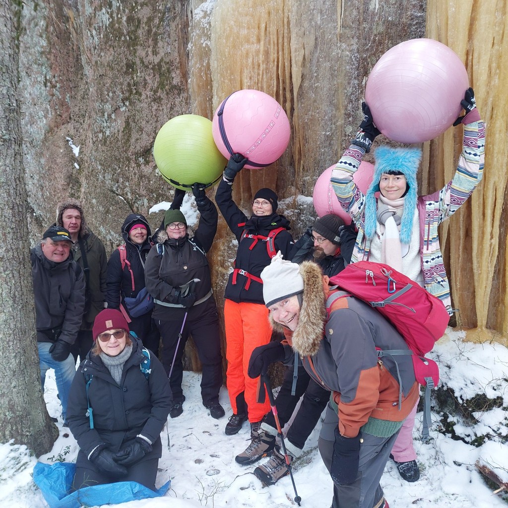 Heti lomien lopuksi lähdettiin palloilemaan! Helsingin Seudun Lapinkävijät olivat järjestäneet loppiaisena (eli Marnion Jari oli järjestänyt) jumppapallogolf-pelin Haltian startista kohti Karjakaivoa. Saavuimme Paun kanssa mestoille tyylikkäästi myöhässä ja löysimme pallon noutamisen jälkeen jotakuinkin tuurilla meluisan ja mainion peliseurueen sieltä lähikukkuloilta. Avisuoran kautta maailmalle levinnyt JPG oli tullut jotenkin tutuksi jo parilla aiemmalla reissulla, jolloin kävimme kenkimässä Askolan hiidenkirnuilla ja Kopparnäsin kivillä. Näistä testeistä oli jo ehtinyt kulua hetkonen tai toinenkin, joten sääntöjä piti taas kertailla. Jumpsautusta en tainnut saada sanottua oikein kertaakaan vaikka sellaisen suoritinkin moneen kertaan.